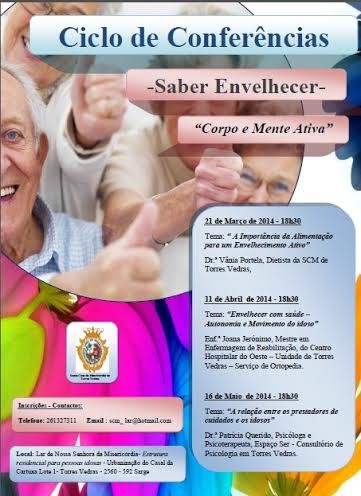 Venho por este meio dar conhecimento da realização de um ciclo de conferências Saber Envelhecer – “Corpo e Mente Ativa”, direccionada especialmente aos funcionários e familiares dos utentes, como também a outras instituições que trabalham na área. O objetivo é dar a conhecer o trabalho realizado com idosos e como prevenir determinadas situações nesta idade a nível psicológico e físico.