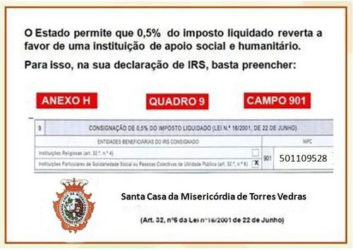 Deste modo, faça a doação de 0,5% do seu IRS à Santa Casa da Misericórdia de Torres Vedras, aproveitando a possibilidade que a lei concede a qualquer cidadão. Trata-se de um contributo, sem quaisquer custos para as pessoas que consignarem 0,5% do IRS.